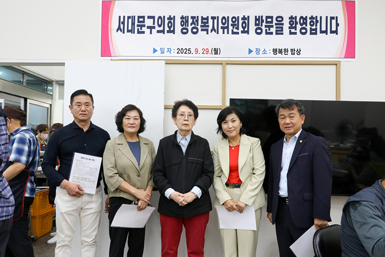 행정복지위원회(위원장 안양식)은 제309회 임시회를 맞아 ‘행복한 밥상’ 운영 현장을 찾았습니다. 올해 3월 개소한 ‘행복한 밥상’은 홍제시니어파크 내 어르신 무료 급식소로 65세 이상 주민 300여 명에게 주 3회 점심 식사를 제공하고 있습니다. 행정복지위원회는 급식 시설, 위생 관리, 이용자 편의 등에 대해 시설을 이용하시는 어르신들의 목소리를 듣는 한편, 급식소에서 근무하시는 어르신들의 근무 환경도 꼼꼼히 살폈습니다. 또한, 구청 담당자, 현장 인력 등과 급식 서비스 수준 향상 및 시설 운영의 효용성 제고를 위해 논의하는 시간을 가졌습니다.