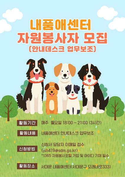 서대문구는 사람과 동물이 함께 안전하고 행복하게 살아가는 지역 환경을 만들기 위해 내품애(愛)센터를 중심으로 다양한 동물 친화 정책을 추진하고 있습니다. 작년 한 해동안 50여 마리가 넘는 반려 동물이 내품애(愛)센터를 통해 새로운 가족을 찾았습니다.